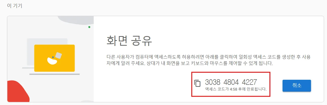 생성된 12자리의 코드를 내 컴퓨터를 사용할 사람에게 공유해줍니다.