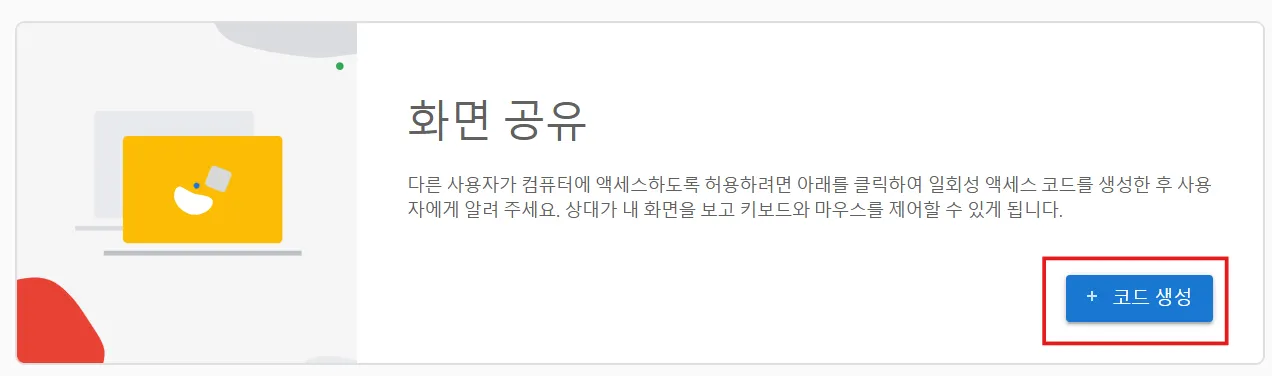 다시 웹페이지로 돌아와 [화면 공유] 섹션에서 [+ 코드 생성]을 클릭하여 액세스 코드를 생성합니다.