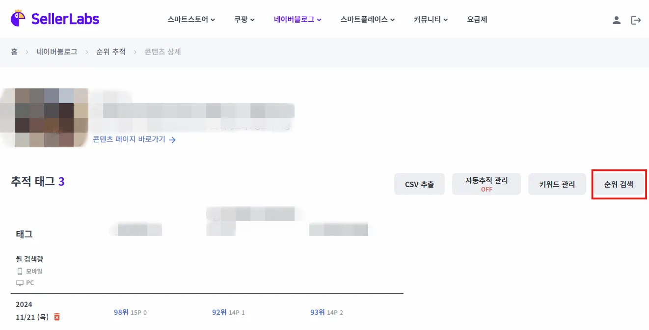 4. 순위 검색을 통해 키워드 순위를 확인해보세요.