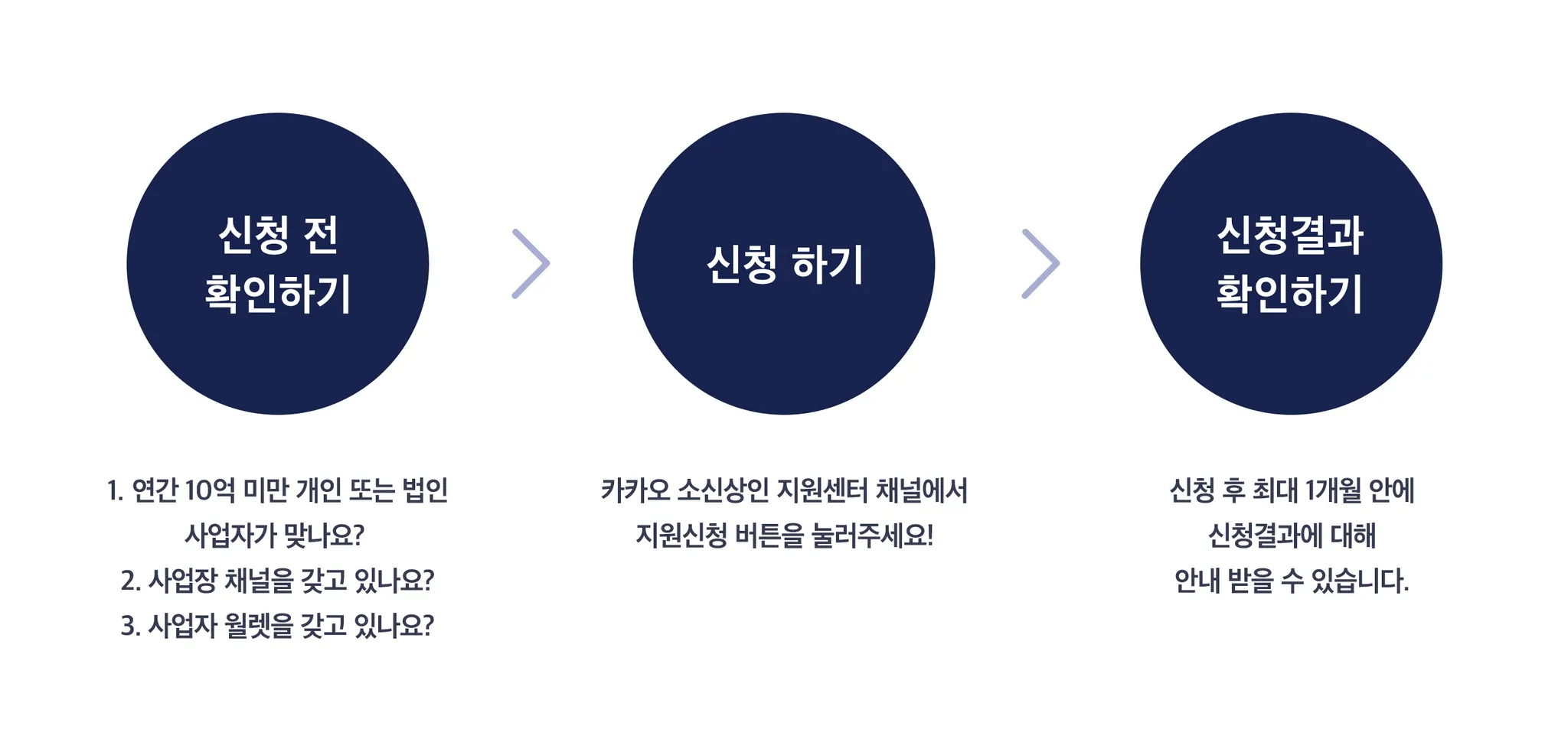 국세청 신고기준 연매출 10억원 이상, 비영리법인, 국가/지방단체의 사업자번호, 또한 사업자 월렛이나 채널없이 지원 신청하신 경우, 이미 소신상인 지원혜택을 받으신경우 등 카카오 내부 기준에 따라 지원대상 여부가 최종 결정됩니다.