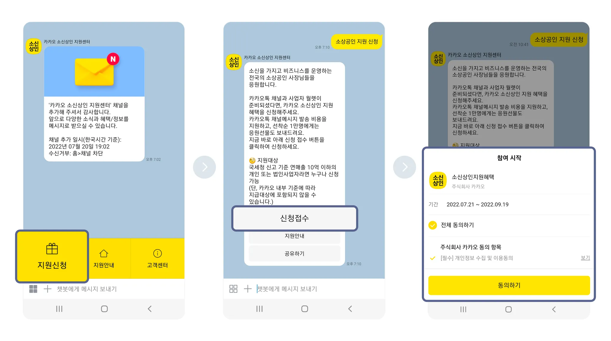 카카오 소신상인 지원센터 채널 채팅창 아래 보이는 [지원신청] 버튼을 눌러주시고, 신청을 완료해주세요!